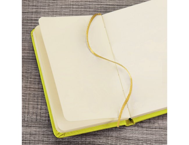 Caderneta emborrachada com elástico para lacre e marcador de página em cetim, contém aproximadamente 84 folhas sem pauta na cor marfim.