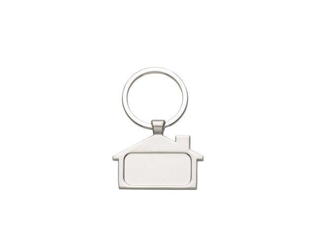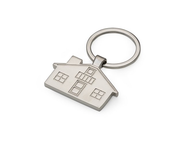 Chaveiro metal fosco formato casa. Parte frontal com desenho em relevo das janelas e portas, verso com um retângulo no centro ideal para personalização.