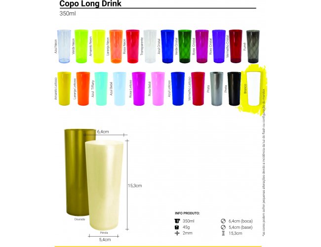 - Cor: Azul Neon, Verde Neon, Amarelo Neon, Laranja Neon, Rosa Neon, Transparente, Azul Cristal, Verde Cristal, Rosa Cristal, Roxo Cristal, Vermelho Cristal, Fumê, Amarelo Leitoso, Laranja Leitoso, Azul Tiffany, Azul bebê, Rosa Leitoso, Rosa bebê, Azul Leitoso, Vermelho Leitoso, Prata, Preto, Branco, Dourado, Pérola