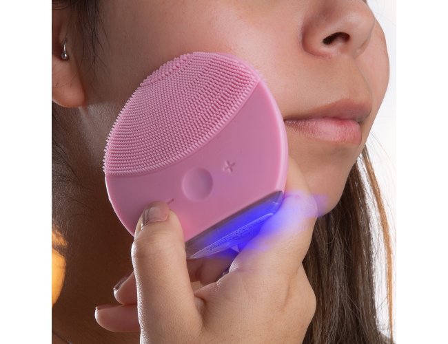 Massageador facial produzido em silicone resistente a água, a escova possui cerdas macias que limpam e massageiam a face. Sua parte frontal possui um botão de acionamento, além de dois botões para alteração entre os 6 modos de intensidade. A limpeza da face através do uso do produto, limpa profundamente os poros melhorando vários aspectos da pele, aumentando o fluxo sanguíneo, prevenindo contra rugas e outras impurezas na pele. O produto possui bateria recarregável com Voltagem de 3.7V e Potência de 0.25W. Acompanha cabo USB.