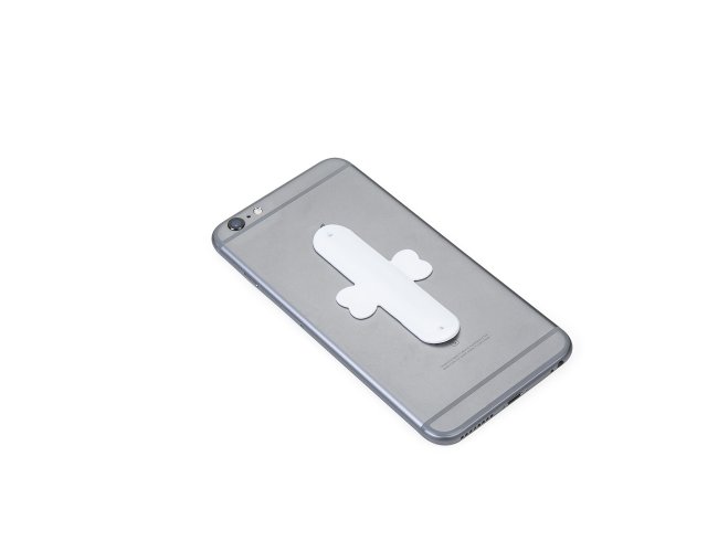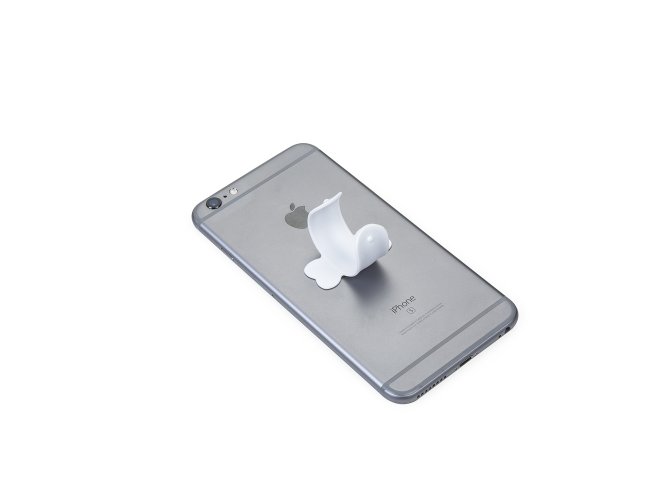Suporte universal flexível para celular. Material de silicone, sua fixação é feita pelos adesivos laterais.